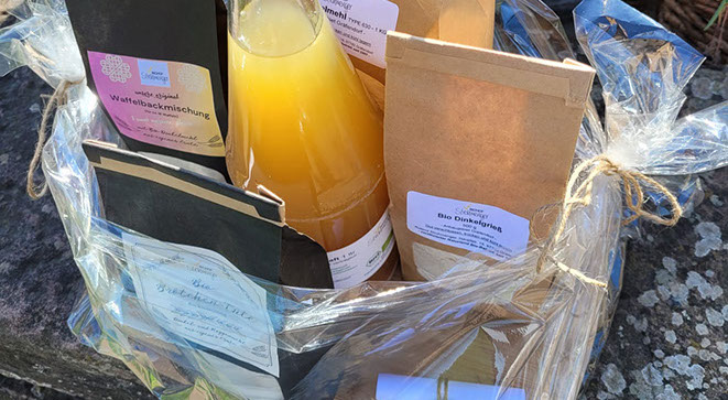 Wie wäre es zum Beispiel mit einer Auswahl aus einer Bio-Brötchentüte, einer Bio-Waffelmischung, Bio-Grieß, Bio-Apfelsaft und einem Dinkelkissen, das zur Entspannung beiträgt? Dazu könnte noch ein Gutschein für ein Bio-Steinofenbrot oder ein Bio-Brathähnchen kommen.